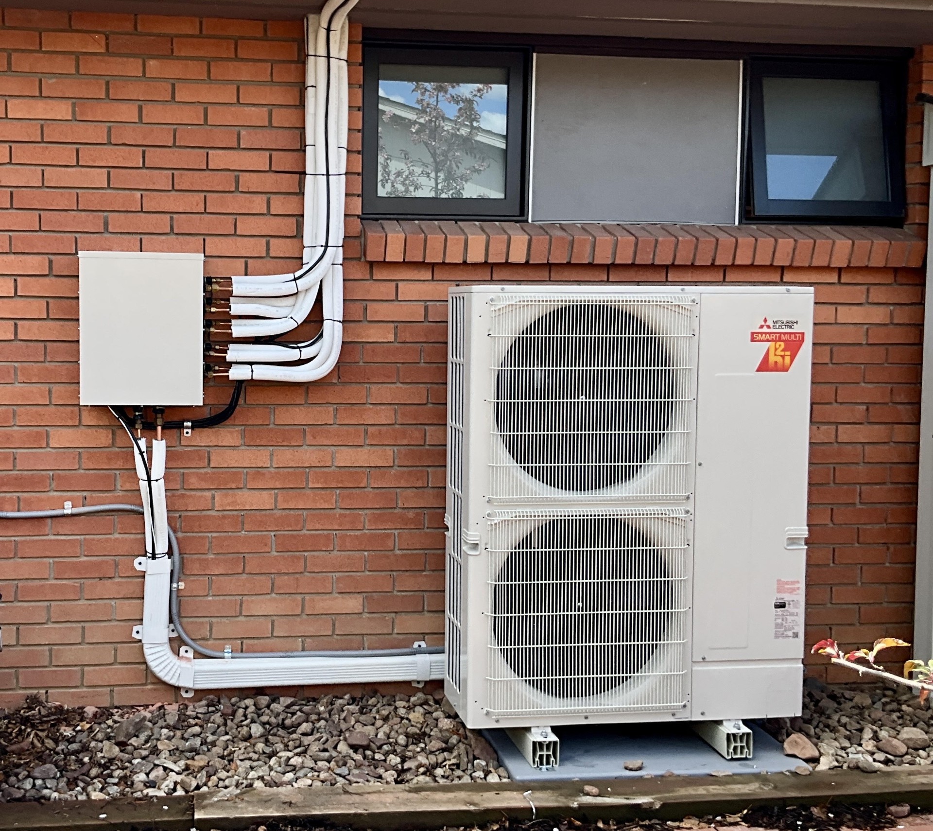 Thanks to their advanced variable-speed compressor and exhaust fan design, the outdoor condensing units and indoor blower units of Mitsubishi H2i mini-split systems are known for being extremely quiet. Depending on the specific model, the sound ratings of their multi-speed indoor blower units can be as low as whisper-quiet 19 dB at low speed, and the outdoor units as low as 46 dB, which is significantly quieter than nearly all central AC or heat pump outdoor units.